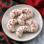 Five crescent-shaped cookies dusted with white powder are placed on a white plate, each cookie decorated with smooth white icing drizzled on top in wavy lines. Small bright red pieces are sprinkled across the icing, adding a pop of color. The plate is set on a white marbled surface with a red cloth and a fabric with red, green, and white plaid patterns nearby. The overall look is festive and inviting. photo taken with an iphone --ar 4:5 --v 7