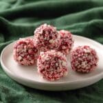 Five round dessert balls covered with small chunks of red and white coating are placed on a white plate. The outer layer is rough and bumpy with the red and white pieces sticking out, giving it a textured, crunchy look. The plate is set on a green cloth with soft folds and wrinkles, adding a cozy background to the scene. The image is taken close up to show the detail on each dessert ball and the plate curves gently upwards at the edges. photo taken with an iphone --ar 4:5 --v 7