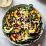 - Assemble the Salad: In a large salad bowl, combine the chopped kale, diced avocado, roasted delicata squash, pumpkin seeds, and pomegranate seeds. Drizzle with the maple mustard dressing and toss gently to combine.