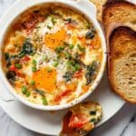 Baked Feta Eggs is a flavorful and wholesome breakfast or brunch dish featuring cherry tomatoes, red bell pepper, onion, garlic, and creamy feta cheese baked together with fresh spinach and eggs. Aromatic herbs and spices add a savory touch, while the eggs bake to perfection in the vegetable and cheese mixture. This easy-to-make meal is perfect for serving individual portions or as a shareable dish, paired with crusty bread for dipping.