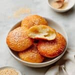 Bánh Tiêu, also known as Vietnamese donuts, are light and airy deep-fried sesame seed-coated dough discs that puff up into hollow, golden-brown delights. Made with simple ingredients like flour, yeast, almond milk, and sesame seeds, these delicious treats are perfect for a snack or dessert and best enjoyed fresh.