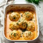 A white rectangular baking dish filled with six round dumplings, each light golden with a slightly rough texture, floating in a thick, creamy orange sauce that covers the base of the dish. The dumplings have a few dark green parsley flakes sprinkled on top, adding contrast. The edges of the baking dish show traces of the sauce baked onto the sides. The dish sits on a light beige cloth on a white marbled surface, with blurred green parsley leaves and a silver spoon in the background. photo taken with an iphone --ar 4:5 --v 7