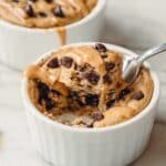 5. Add peanut butter and chocolate chips: Spoon 1 tablespoon of peanut butter into each ramekin and mix gently to incorporate. Stir in most of the chocolate chips, then scatter the remaining chips on top for extra melty goodness.