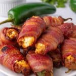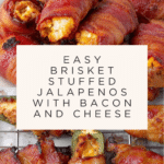 These Brisket Stuffed Jalapenos are a delicious smoky and spicy appetizer featuring jalapeno peppers filled with a creamy mixture of leftover brisket, cream cheese, sharp cheddar, and green onions, all wrapped in crispy bacon and baked to perfection with a BBQ glaze.