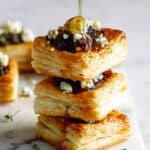 These Caramelized Onion & Blue Cheese Puff Pastry Tarts are elegant, savory bites perfect for entertaining or a sophisticated snack. Sweet caramelized onions pair beautifully with tangy blue cheese and a touch of fig jam on flaky puff pastry, finished with fresh thyme and a honey drizzle for a perfect balance of flavors.