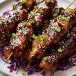 Several wooden skewers hold thick, glossy pieces of grilled chicken, each piece coated with a shiny dark brown sauce that looks sticky and rich. The chicken is sprinkled with small white sesame seeds and some chopped bright green onions, adding a fresh touch. The skewers rest on a white plate layered with thin strands of purple cabbage, giving a splash of color under the chicken. The whole plate sits on a white marbled surface. photo taken with an iphone --ar 4:5 --v 7