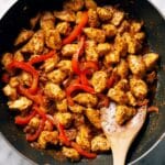 A close-up view of a black pan filled with cooked chicken pieces and sliced red bell peppers. The chicken is cut into small chunks, coated in a slightly shiny reddish-brown sauce with visible spices, giving it a rich texture. The red bell pepper slices are scattered evenly throughout, adding bright spots of color. A wooden spoon rests on the right side inside the pan, partially covered with sauce. The pan sits on a white marbled surface. photo taken with an iphone --ar 4:5 --v 7