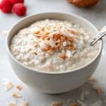 A white bowl filled with creamy oatmeal, light beige in color with a thick and soft texture, topped with a small pile of golden brown toasted coconut flakes scattered on top. The bowl sits on a white marbled textured surface with a spoon inside the bowl on the right side. Some toasted coconut flakes are also scattered around the bowl on the surface. In the blurred background, there are two red raspberries and a half coconut shell. photo taken with an iphone --ar 4:5 --v 7