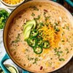 This creamy white chicken chili is a flavorful, comforting dish combining tender shredded rotisserie chicken, white and pinto beans, spicy green chilies, and a blend of aromatic spices. Enriched with cream cheese and savory chicken broth, it offers a rich and smooth texture perfect for a cozy meal, topped with classic garnishes like cheddar cheese, sour cream, cilantro, and lime.