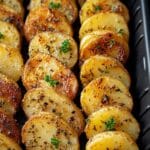 The image shows rows of golden brown roasted potato slices arranged in neat lines inside a black ribbed tray, each potato slice having a crispy outer layer with a slightly charred texture and sprinkled with black pepper, herbs, and small green parsley leaves. The potatoes are cut about half an inch thick, showing a soft pale yellow inside that contrasts with the crunchy, spiced edges. The close-up view highlights the texture differences between the smooth inside and the crispy browned surfaces, with light reflecting off the herbs and spices scattered over the potatoes. photo taken with an iphone --ar 4:5 --v 7
