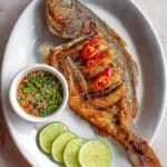A whole fried fish with a crispy golden-brown skin lies centered on a large white plate. The fish is split open, showing layers of slightly darker cooked flesh inside, topped with two slices of bright red chili peppers placed near the middle. To the right of the fish, three thin lime slices with a pale green color and white inner sections are arranged side by side. On the upper left of the plate, a small white bowl holds a mix of green chopped chilies and sliced red chili rings floating in a thin sauce, sprinkled with light brown seeds. The plate sits on a white marbled textured surface. photo taken with an iphone --ar 4:5 --v 7