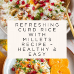 Curd Rice with Millets is a comforting, wholesome South Indian dish featuring samo rice (white barnyard millet) cooked and mixed with smooth, creamy yogurt and fresh vegetables. Enhanced with a hot tempering of ghee, cumin, peanuts, and aromatic spices, this dish offers a refreshing and nutritious meal that is light yet flavorful, perfect for warm days or as a cooling accompaniment to spicy meals.