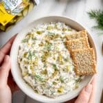 This creamy and tangy Dill Pickle Dip combines the bright flavors of fresh dill, chives, and parsley with the zesty punch of dill pickles and lemon. Perfect as a flavorful appetizer, it pairs wonderfully with toasted everything flatbreads for a delightful snack or party dip.