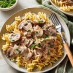 This easy Mushroom Stroganoff is a creamy, comforting dish featuring sautéed mushrooms and onions in a rich, tangy sour cream sauce. Perfect over egg noodles, it’s a vegetarian twist on the classic beef stroganoff, delivering delicious flavors with simple ingredients and a quick preparation.
