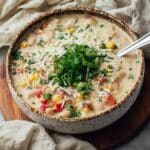 Keywords: white chicken chili, southwest chili, easy chicken chili, rotisserie chicken recipe, masa harina chili, salsa verde chili, hearty chicken soup