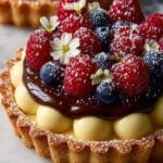 These Elegant White Chocolate Mousse Tartlets combine a crisp graham cracker crust with a luscious white chocolate mousse filling. Topped with fresh raspberries, a drizzle of caramel sauce, and delicate edible flowers, these tartlets make a stunning dessert perfect for special occasions or a refined treat.