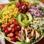 A white bowl filled with a fresh, colorful salad arranged in neat sections on a bed of green romaine lettuce. Starting from the top left, there is bright yellow grilled corn with grill marks, next to crispy reddish-brown chopped bacon. To the right of the bacon, thin slices of green avocado fanned out, followed by thin purple slices of red onion. On the bottom right rests a pile of crumbled white cheese. In the center bottom, vibrant red halved cherry tomatoes are grouped, and next to them on the bottom left, slices of grilled chicken breast with visible char marks lie stacked over the lettuce. The whole salad looks lightly sprinkled with green herbs. The bowl sits on a white marbled surface with wooden salad spoons in the background. A small glass bowl of dressing is in front. Photo taken with an iphone --ar 4:5 --v 7