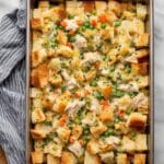 This Leftover Turkey Casserole is a comforting and easy way to transform leftover turkey into a hearty meal. Combining tender turkey chunks with creamy mozzarella-infused gravy, vibrant vegetables, and savory cornbread, this casserole is baked to perfection and makes a perfect family-friendly dish for a cozy dinner or to use up holiday leftovers.