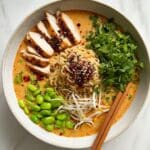 Marry Me Chicken Ramen is a comforting and flavorful dish that combines tender pan-fried chicken breasts with a creamy, spiced broth infused with sun-dried tomatoes, smoked paprika, and a hint of chili flakes. Served with ramen noodles and fresh, crunchy toppings like coriander, beansprouts, and edamame beans, this recipe balances creamy and spicy notes for a satisfying meal perfect for any day of the week.