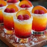 Peach Ring Pop Shots are a fun and festive cocktail perfect for parties and celebrations. These sweet and tangy shots combine peach schnapps, vodka, and a citrus mixer, rimmed with sparkling sugar and garnished with iconic peach ring gummies to create a playful ring pop effect.