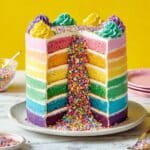 20. Step 20: Finish by sprinkling the remaining Unicorn Confetti Sprinkles over the top. Your stunning piñata cake is ready to impress and enjoy!