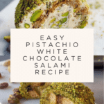 Keywords: pistachio salami, white chocolate dessert, no bake dessert, nutty treat, holiday dessert, easy chocolate recipe
