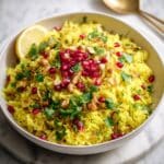 - Add Final Touches: Turn off the heat. Squeeze fresh lime juice over the poha and sprinkle chopped cilantro leaves on top. Garnish with sev, pomegranate seeds, or freshly grated coconut according to preference before serving.