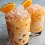 Two clear glasses filled with a creamy orange and white drink that has a swirled texture from the mix of liquids. Each glass is topped with a heap of crushed ice, giving a shiny, crystalline effect. Behind the crushed ice, there is a slice of bright orange fruit placed on the rim, adding a pop of fresh color. The glasses stand on a white marbled surface that softly reflects the drinks. The overall look feels cold and refreshing, with rich colors blending through the layers. photo taken with an iphone --ar 4:5 --v 7