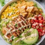 Store leftover salad components separately in airtight containers in the refrigerator for up to 2 days. Keep tortilla strips separate to maintain crunch. Reheat chicken before assembling salad if desired. Dress the salad just before serving to avoid sogginess.