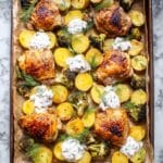 7. Finish and Serve: Remove the sheet pan from the oven, drizzle the remaining yogurt marinade over the chicken and vegetables, sprinkle with fresh dill, and serve immediately.