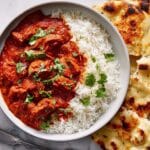 - Serve: Garnish the butter chicken with fresh cilantro leaves if desired. Serve hot with basmati or jasmine rice and naan on the side for a complete meal.