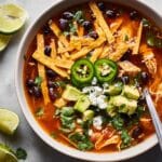 - Serve with Toppings: Ladle the soup into bowls and top with tortilla strips. Add optional toppings such as sliced avocado, fresh cilantro, shredded cheese, or sour cream for extra flavor and texture.