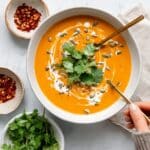 - Serve: Pour the soup into bowls, swirl the reserved 2 tablespoons of coconut milk on top for a decorative touch, and garnish with freshly chopped coriander or cilantro. Serve warm and enjoy your creamy, spicy soup!