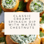 A classic, creamy spinach dip made with thawed frozen spinach, crunchy water chestnuts, sour cream, and mayonnaise, enhanced with dry vegetable soup mix and fresh green onions. Perfectly chilled and served in a sourdough bread bowl for a delightful appetizer or party snack.