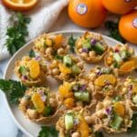 Sumo Citrus Chaat Cups are a refreshing and tangy appetizer featuring crisp mini phyllo cups filled with a zesty mixture of chickpeas, juicy Sumo Citrus segments, cucumber, red onion, and aromatic cilantro, seasoned with chaat masala and lime juice for a burst of Indian-inspired flavor. Perfectly bite-sized and garnished with optional green chutney, these chaat cups are an easy no-cook dish that combines sweet, sour, and spicy notes for a vibrant snack or party starter.