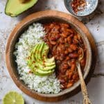 A rustic bowl shows two main layers: on the left, a fluffy white rice mixed with green herbs and sprinkled lightly with red chili flakes, and on the right, a thick, rich reddish-brown stew full of beans and small vegetable pieces with a glossy texture. On top of the rice, a sliced avocado fanned out, bright green with a sprinkle of red chili flakes. The bowl sits on a small wooden board placed on a white marbled surface. Nearby, a halved avocado and two lime halves add fresh green and yellow tones, with a small white bowl patterned in blue and some red seasoning inside, and a golden ornate spoon resting in the stew, partly in the bowl. Photo taken with an iphone --ar 4:5 --v 7